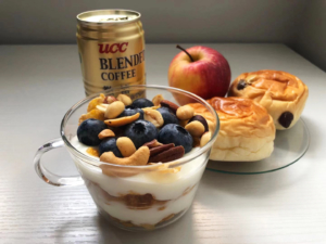 This is my favorite homemade quick breakfast of a cup of yogurt with corn flakes, various nuts, and blueberry. What’s more, buns or pieces of toast with peanut or fruit jam and fried eggs are also added. All I have in my apartment sharing kitchen is a micro oven… How I miss the fresh smell of toast and the sunny-side-up egg!! Last but the least, coffee is the must-have one in the morning. Otherwise, I will be sleepy all day… I prefer instant coffee on weekdays and hand drip coffee on weekends.