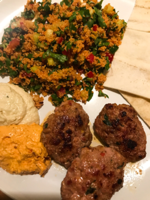 This is the food I have prepared for myself. It is a Turkish dish, which consists of Kisir and Köfte. As side dish thin bread and hummus. Mostly I eat this dish with my hands. When I prepare this dish for my friends and family, we put all the ingredients in the middle and share the food together. My favorite ingredient in this dish is fresh parsley and mint. When you chop these ingredients it smells like you are standing in the middle of a garden.